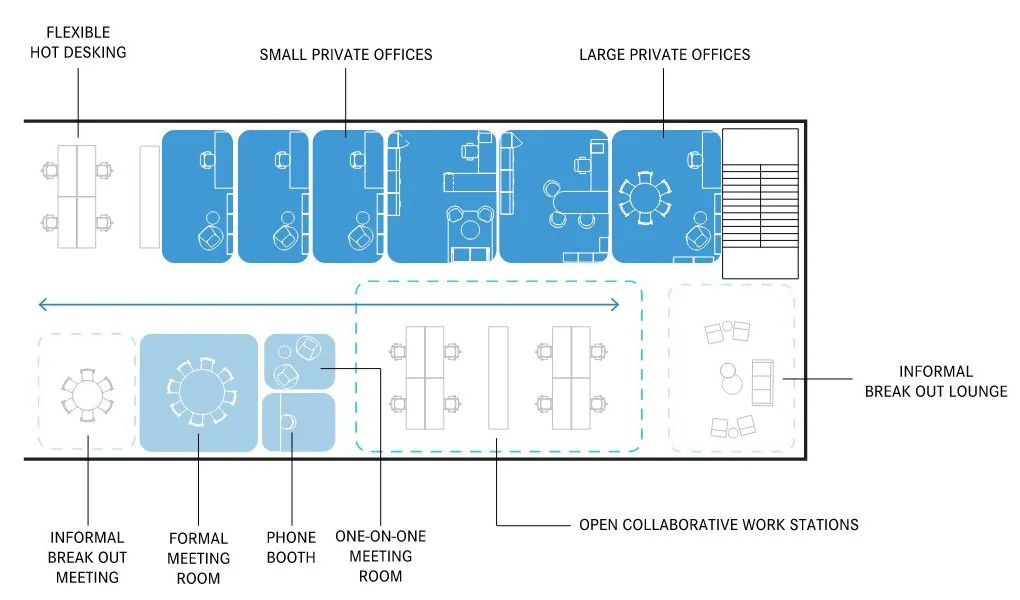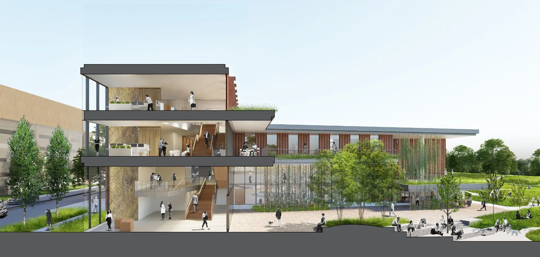 Whether you are a visitor or someone that comes to work, one arrives at the lobby and mezzanine overlooking the park and then connects up and through the building in its social center. Active design was prioritized to encourage occupants to undertake regular physical activity by walking between nodes and taking stairs.