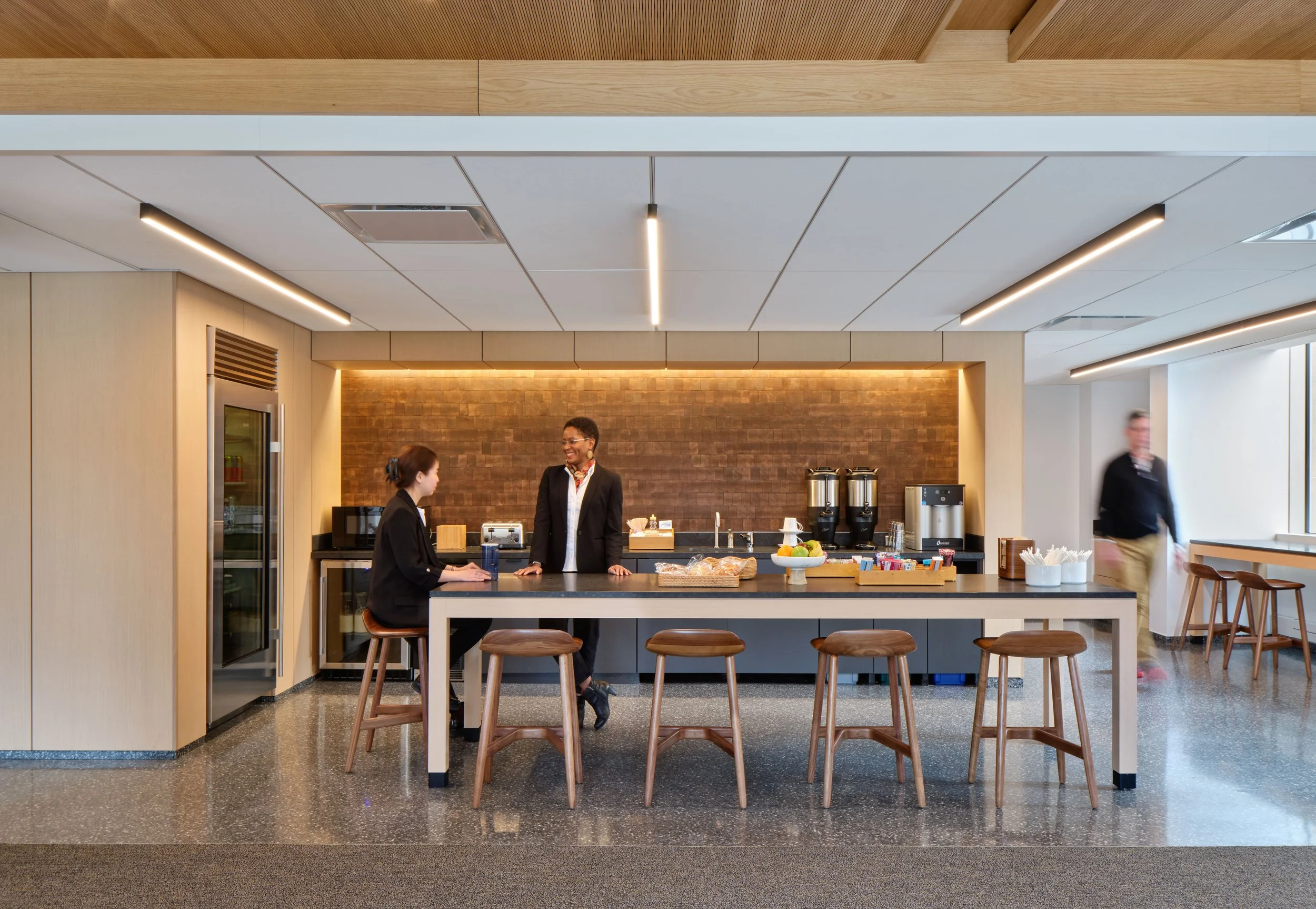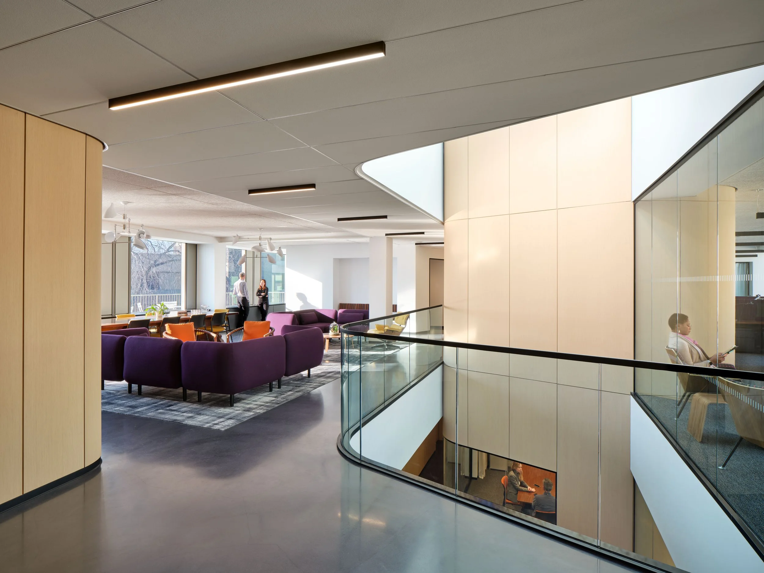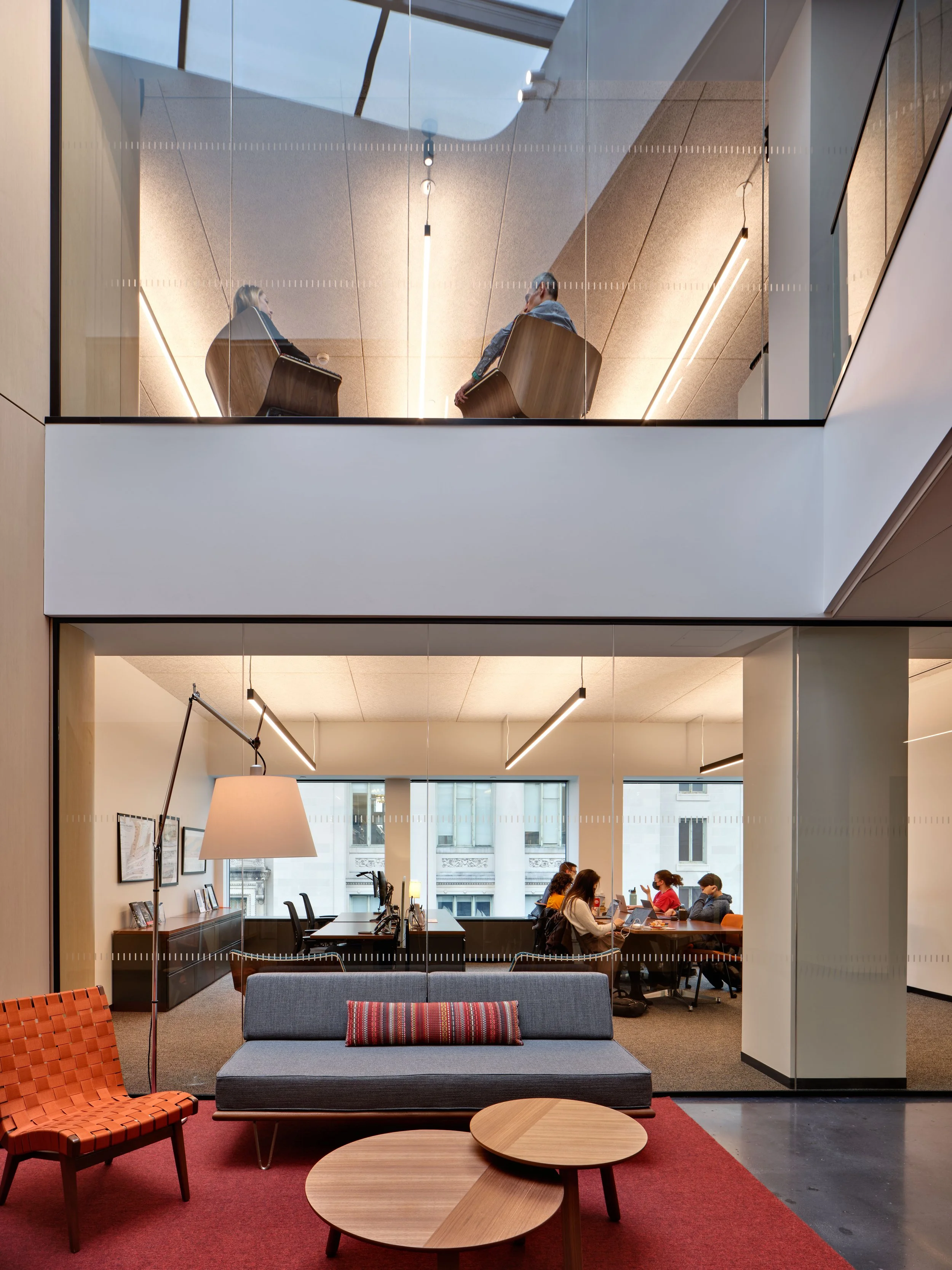 Inside, several sections of floor were removed to create interlocking spaces that foster collaboration, learning, and co-working. Flexible conference and meeting rooms and collaborative areas encourage interdisciplinary work.