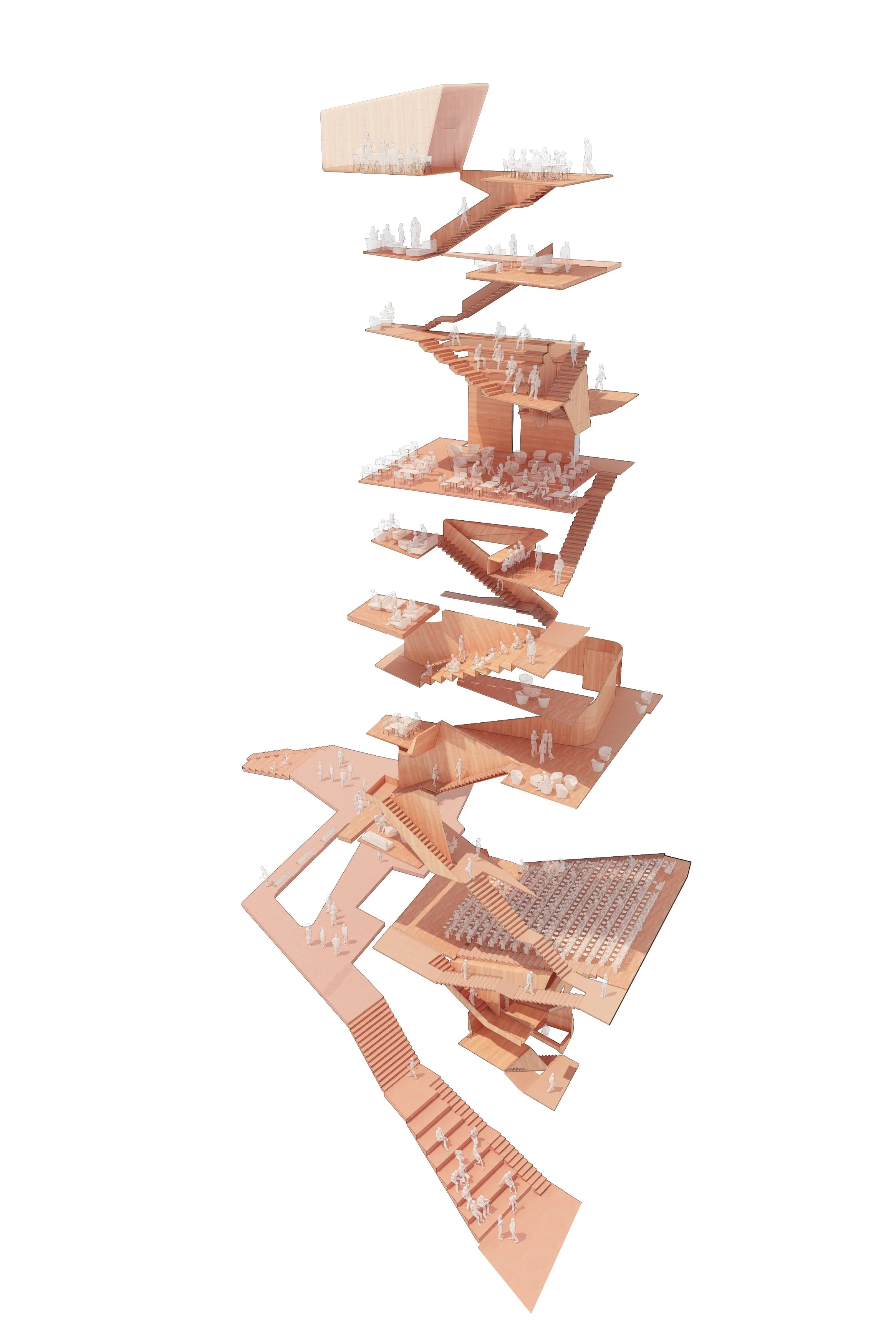 The study cascade is imagined as a continuous stretch of wood that ‘drips’ down the entire facade. The wood is meant to be a visual signifier of public space within the building. Within it contains all of the lounge, meeting, and study spaces for the school. It is the social DNA that ties the building together.