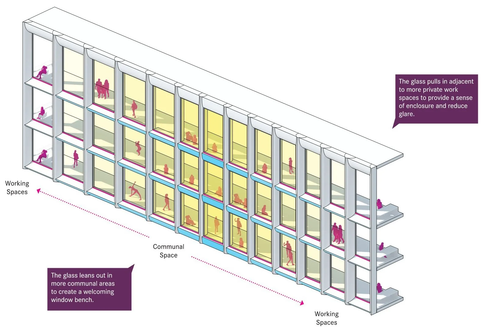 The new facade was designed to perform programmatically along multiple axes. The glass line relative to the floor slab leans outward in more communal areas to create welcoming window benches.