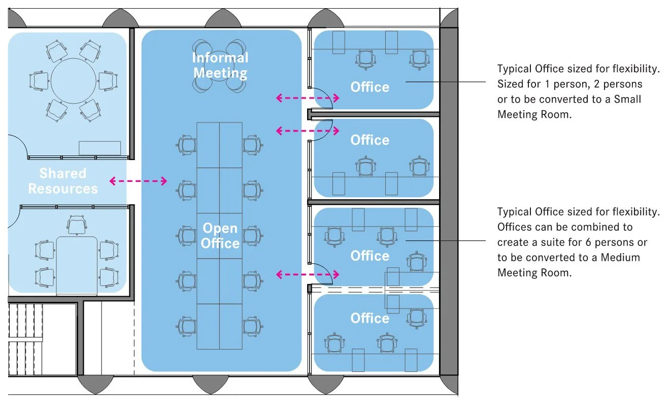 Workspaces in the building were designed around a gradient of types that ranged from unstructured social space, to group work areas, meeting rooms and private offices.