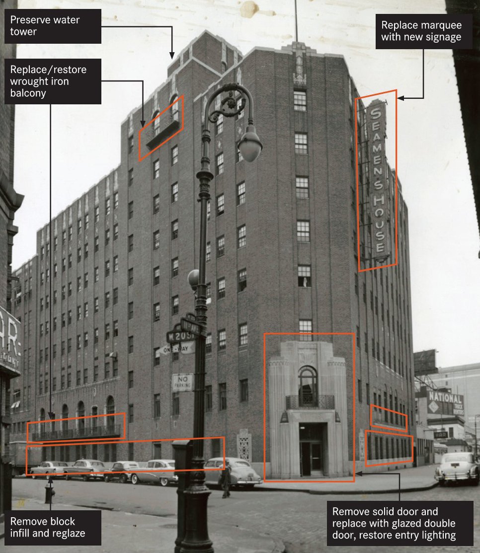The existing building facade was designed to be preserved and restored, with select historic and ornamental features from the existing interior spaces salvaged for display and reuse. The existing building was built on wooden piles and required significant structural updates to achieve program and flooding mitigation goals.