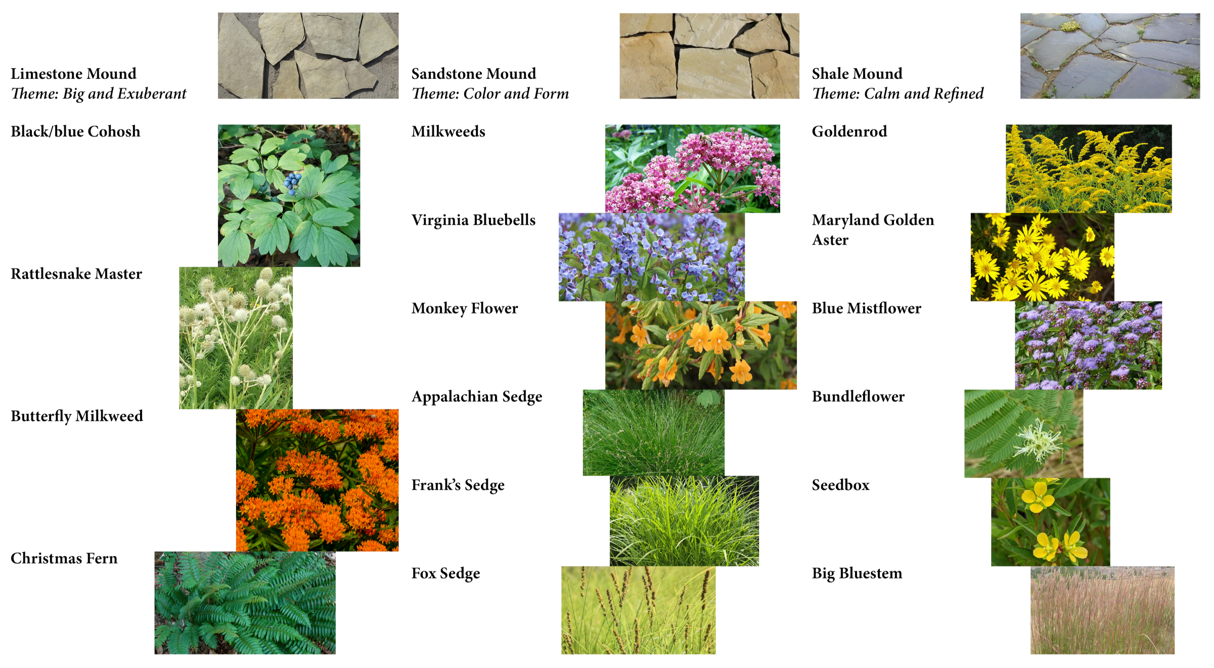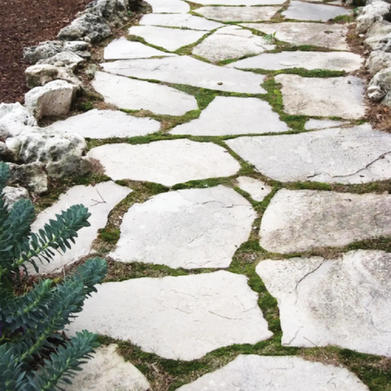 Stone flagstone in random sizes between 12”-24” will be laid in an interlocking pattern on top of the created mounds. The pattern created is similar to how a traditional stone pathway is laid (above right). Gaps will be left between the stone to allow for both planned and unplanned plant growth over time. The planting narrative was developed with Davi Schoen Landscape based upon themes related to each stone type (below).