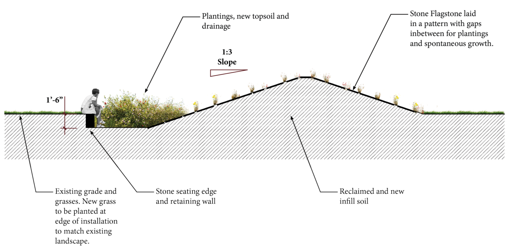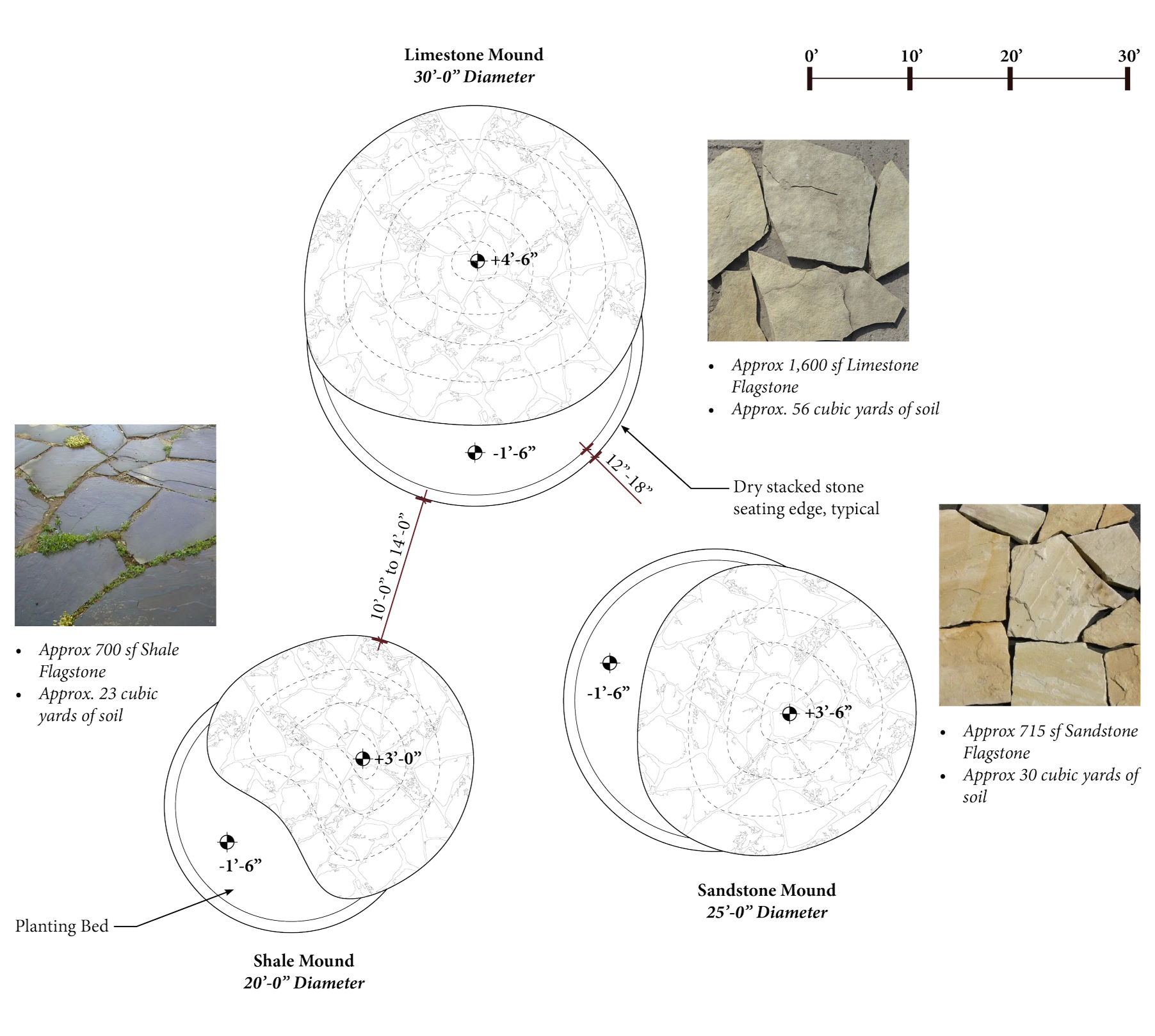 Each mound has an associated seating and planting area that is recessed into the ground by 18” and bounded by dry stacked stone installed in a similar manner to traditional Kentucky stone fences (below). The mounds themselves range in height from 3’-0” to 4’-6” tall and are constructed at a 1:3 slope so that no additional slope reinforcement will be required. The mounds will be partially constructed from soil dug up from site and supplemented by purchased fill.
