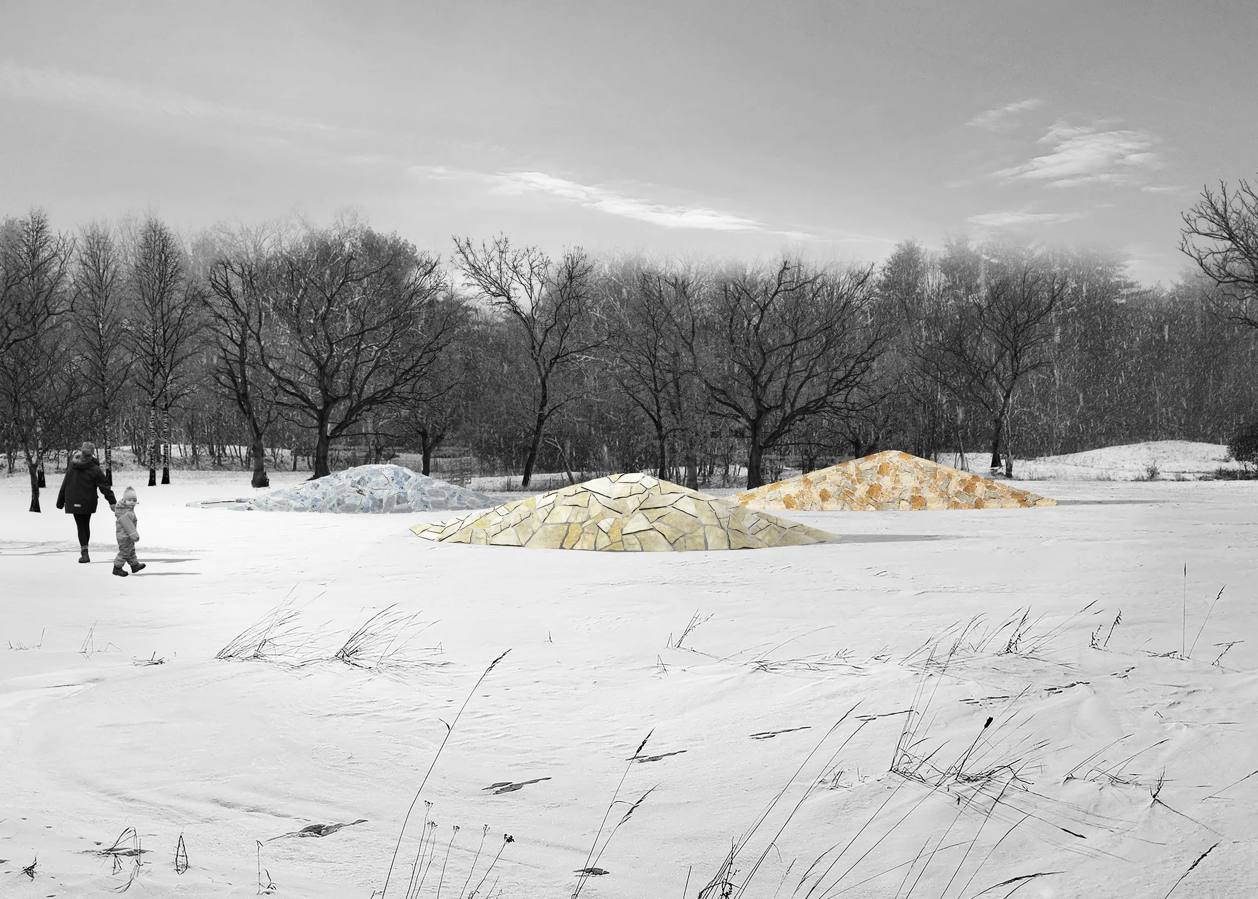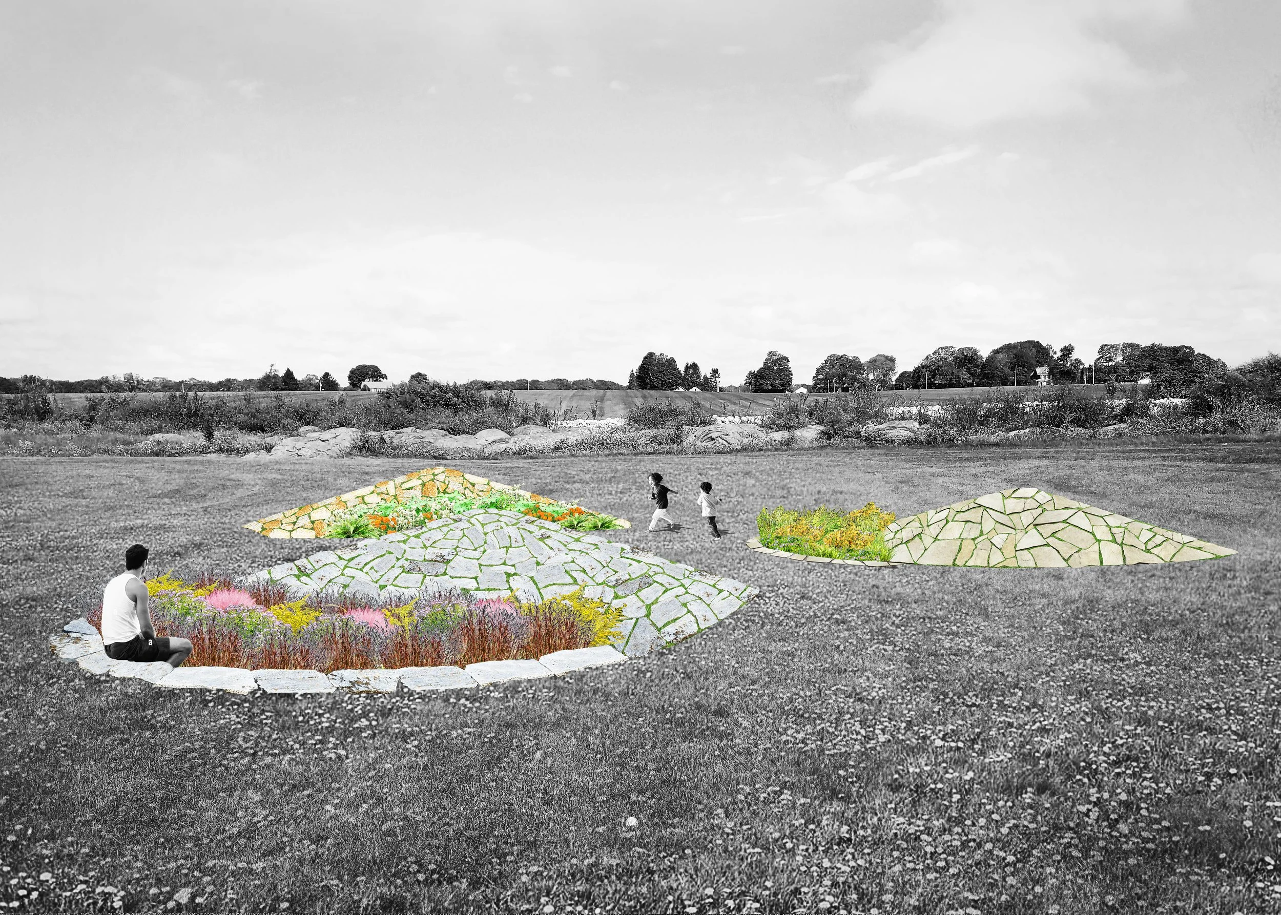 A group of sculpturally planted mounds, incorporating local stone and inspired by the natural landforms of the Kentucky Knobs, creates a field of moments for contemplating our connections with the earth and future possibilities for what might emerge and grow on these grounds. The design intent is to create a formation that allows for a variety of views from within and outside of the grouping. The space created will allow individuals to find moments of solitude that are punctuated by views and impressions of other people through and around the “knobs.”