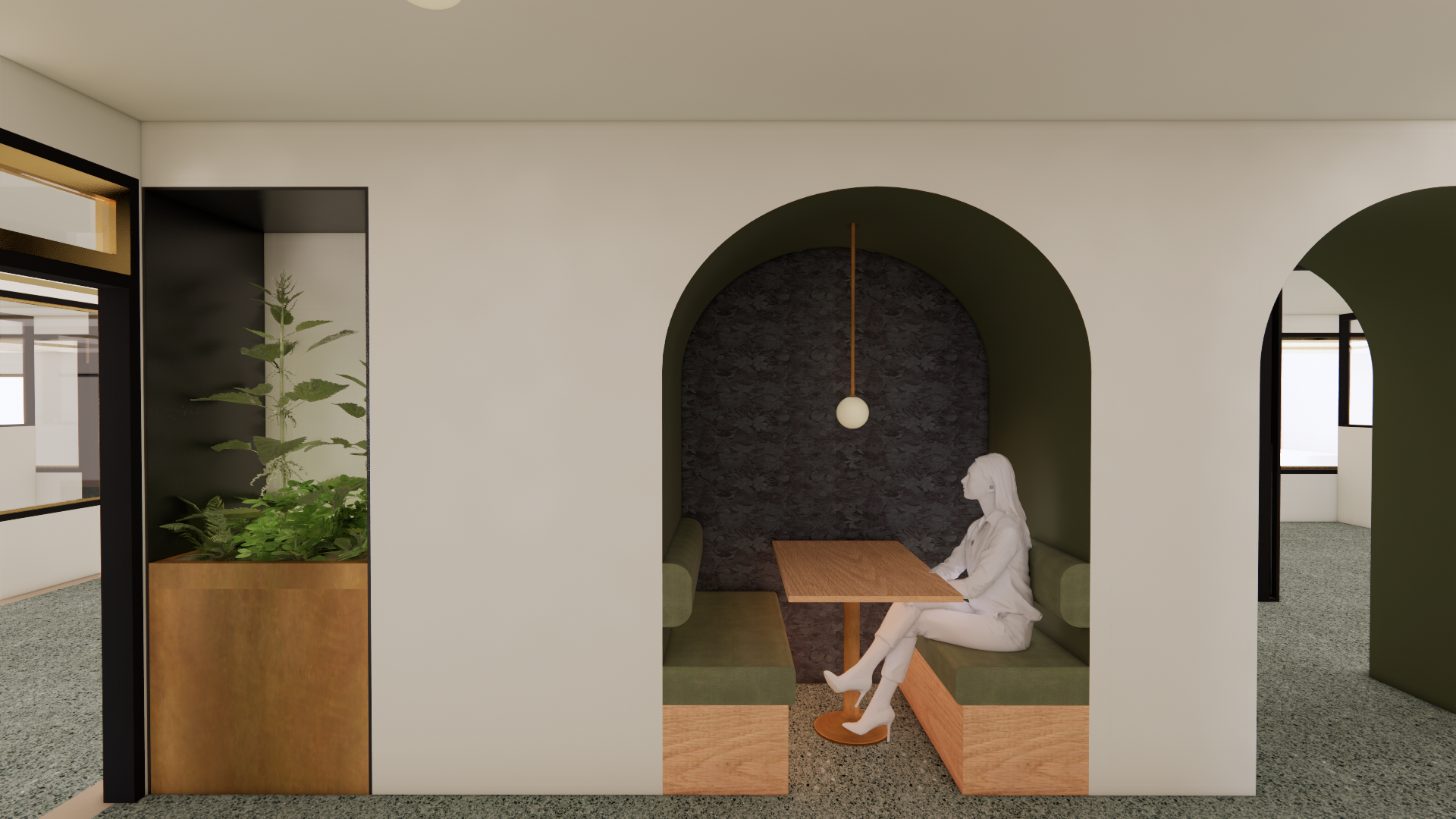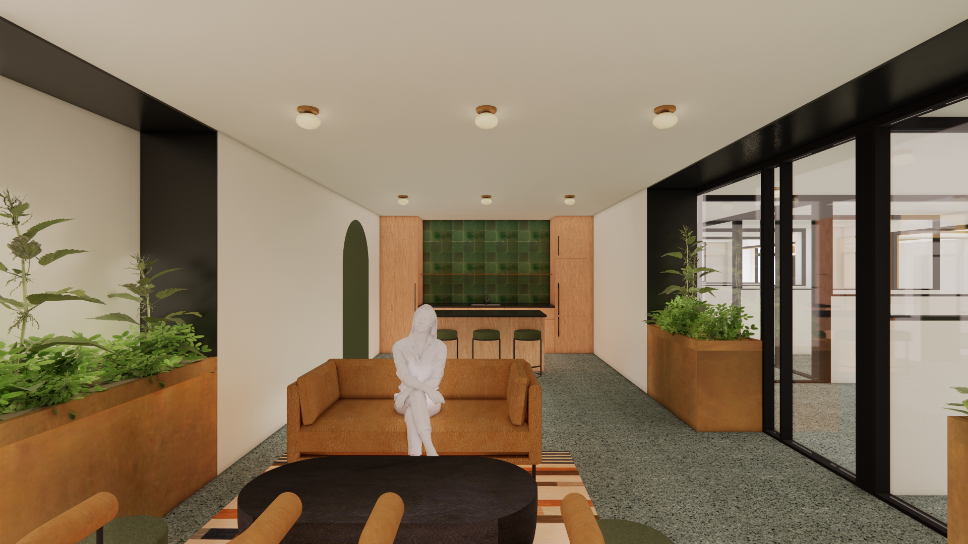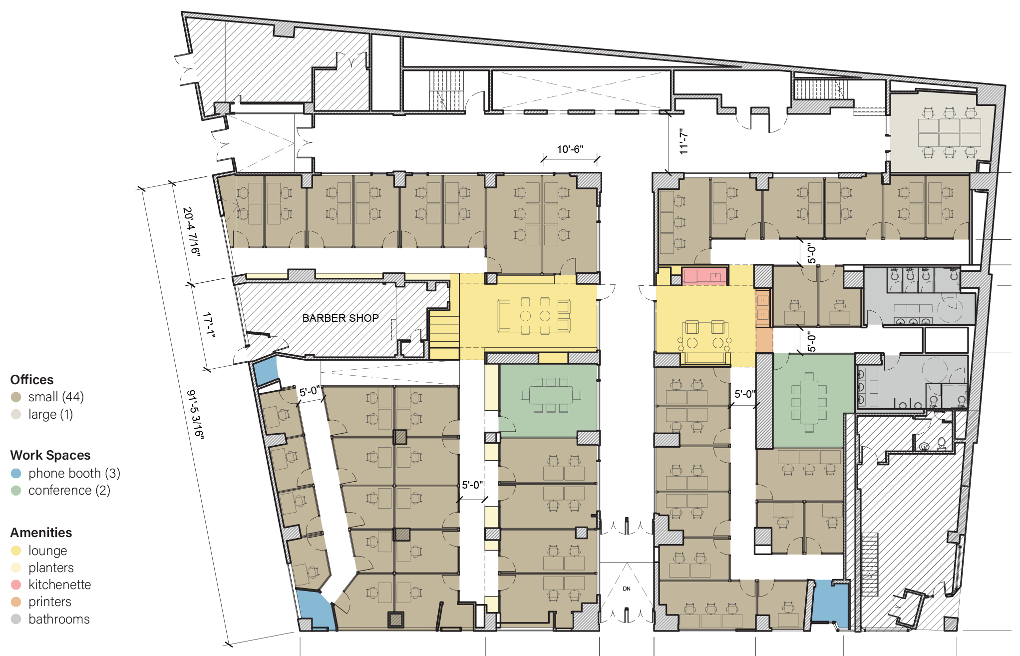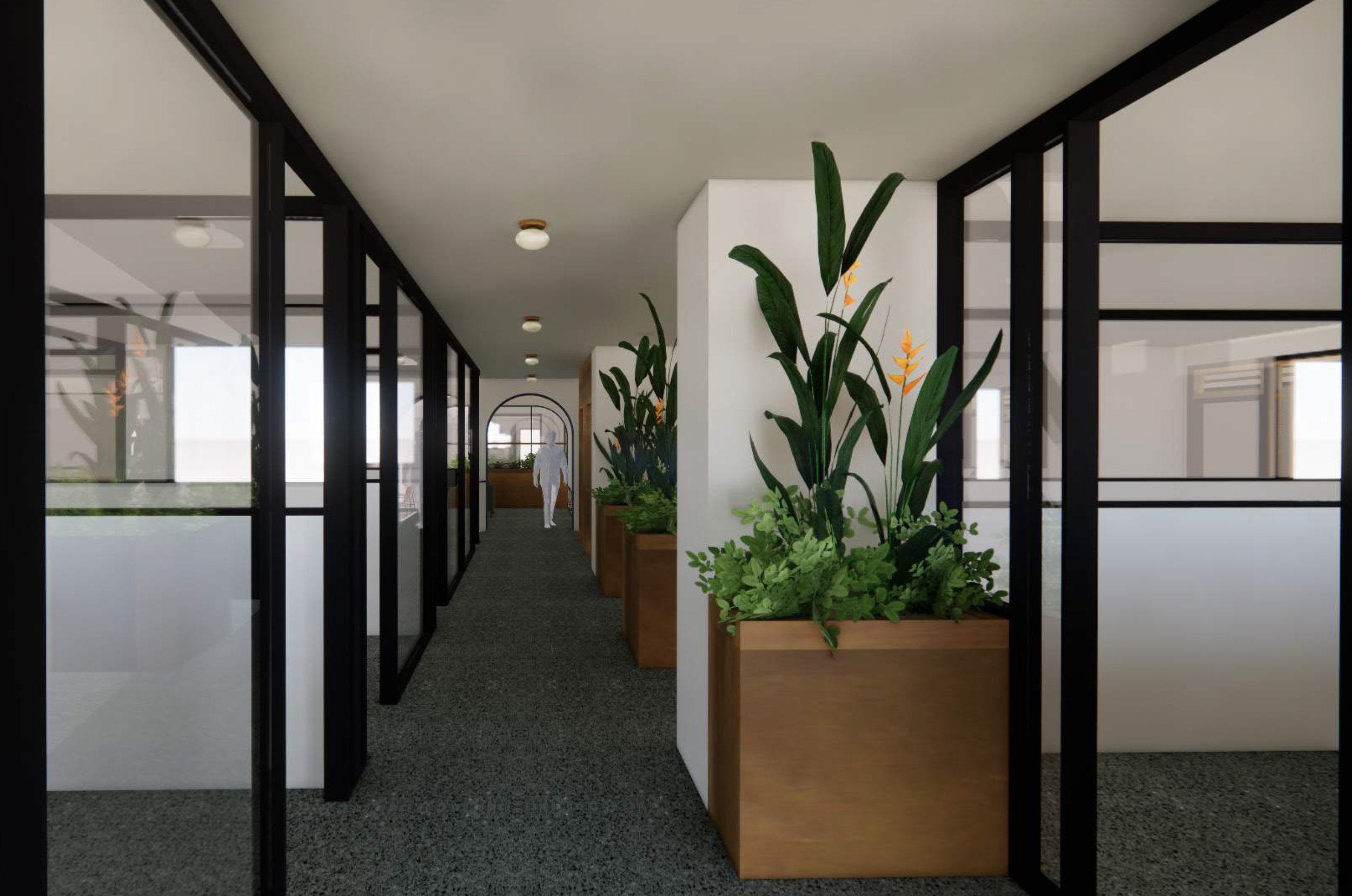 The ground floor (below) was completely re-imagined as a co-working floor with a variety of private offices, shared workspaces, and group amenities. Due to the deep floor plate and limited access to natural light, floor to ceiling partitions are utilized throughout with the option for individual tenants to frost their workspace. Planter boxes are also integrated throughout to provide a visual respite from the office rows and a restorative link to the natural world.