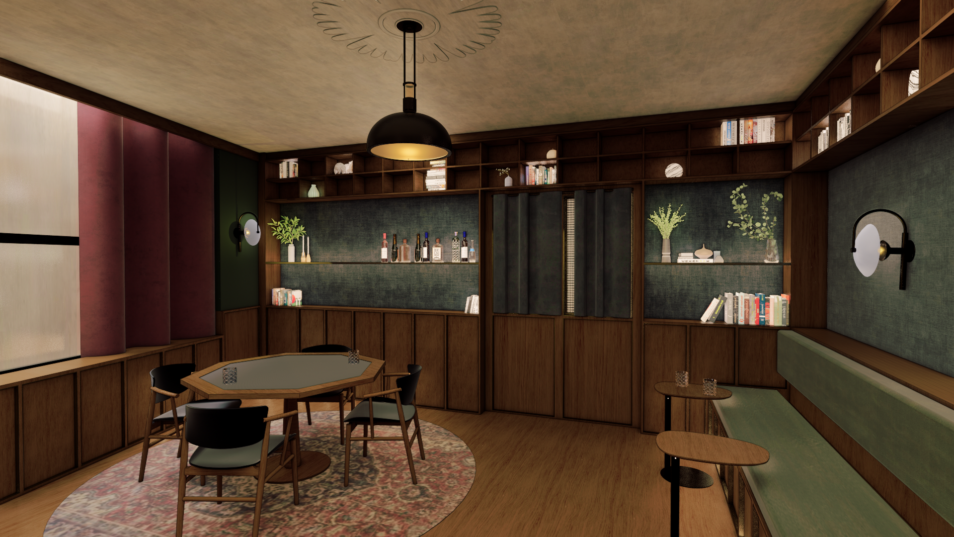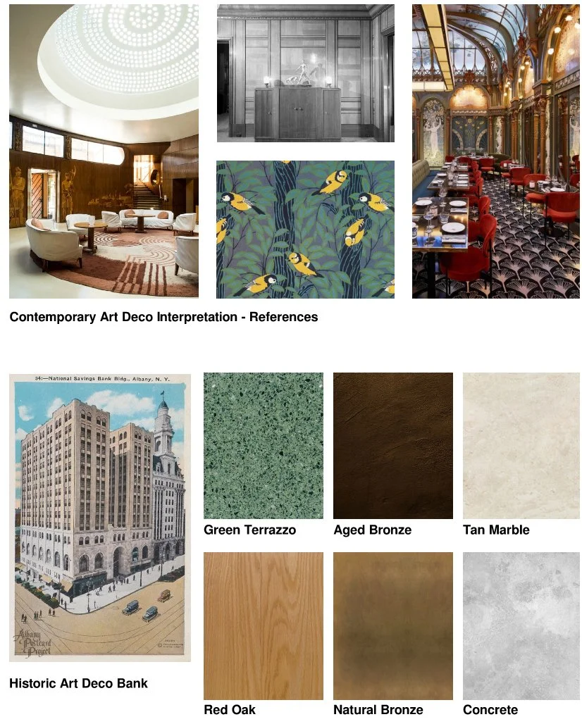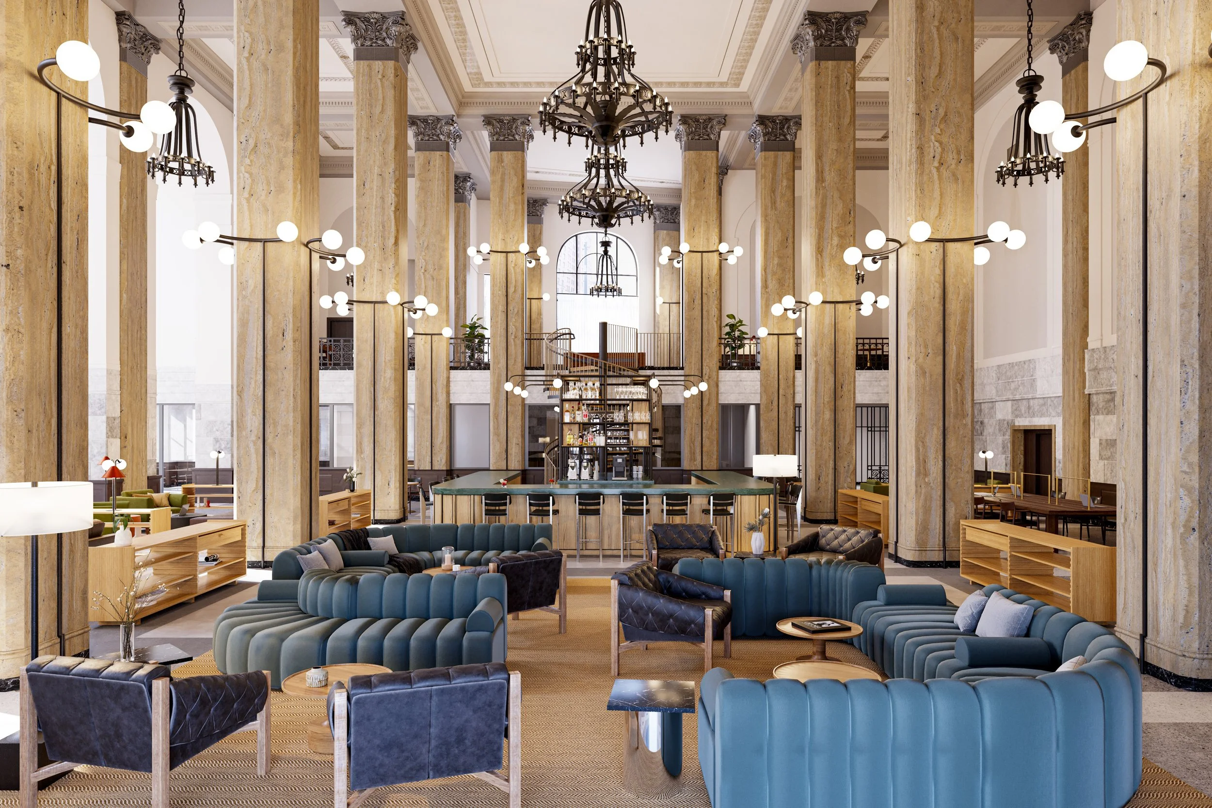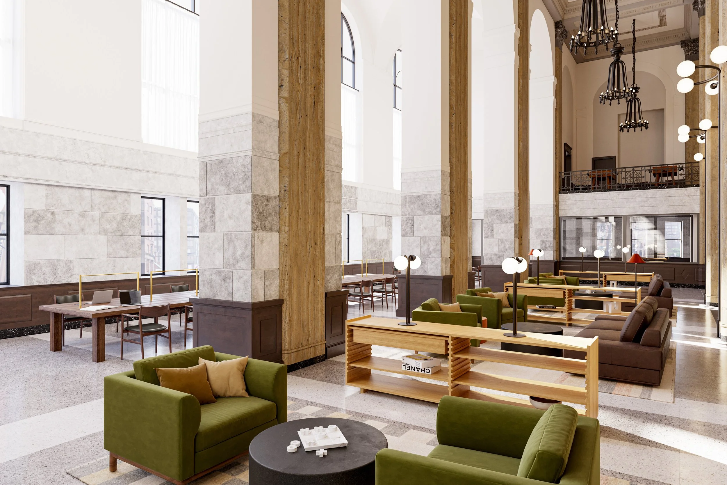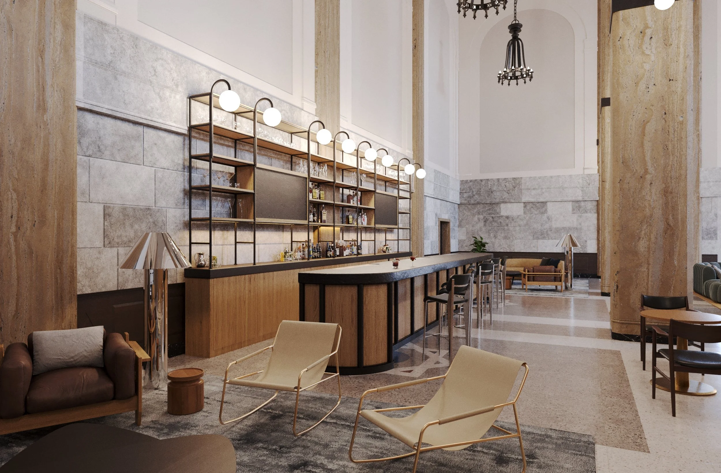 JOW Office partnered with Office JDY to reimagine the amenity and co-working spaces in the historic 90 State St. bank in downtown Albany, NY for a younger and more mobile clientele. The bank was in the process of being developed into a rental building when we were brought on to provide concept design, documentation and FF&E services for the building’s public spaces. Our design concept focused on the intersection of four spheres: health, education, wellness and work. To that end we designed a constellation of interconnected programs that bridged each of these categories including a bar (above), private dining, game rooms, media center, fitness center, workspaces, and a slew of cozy lounge areas.
