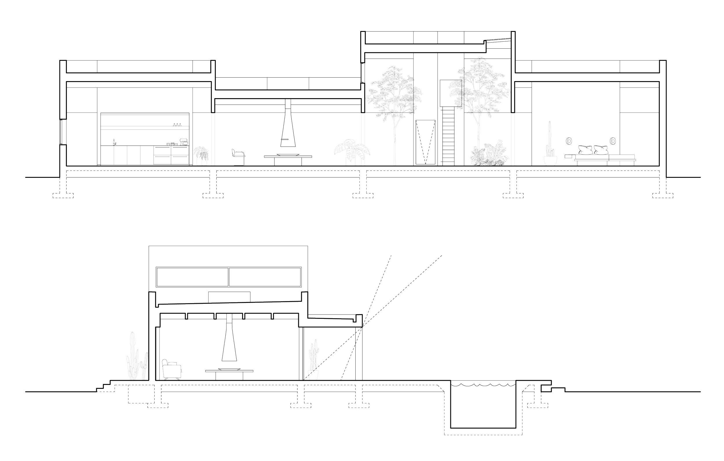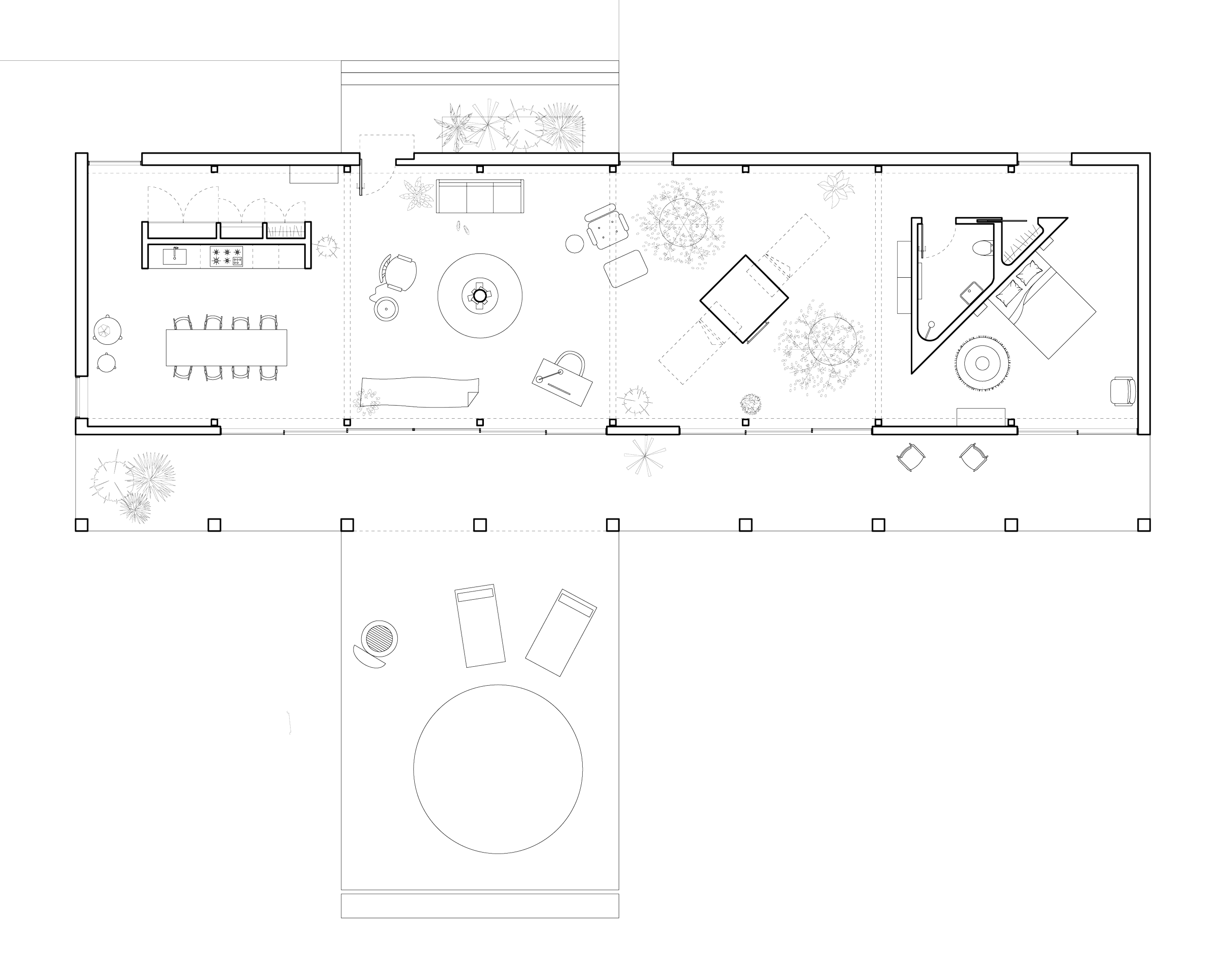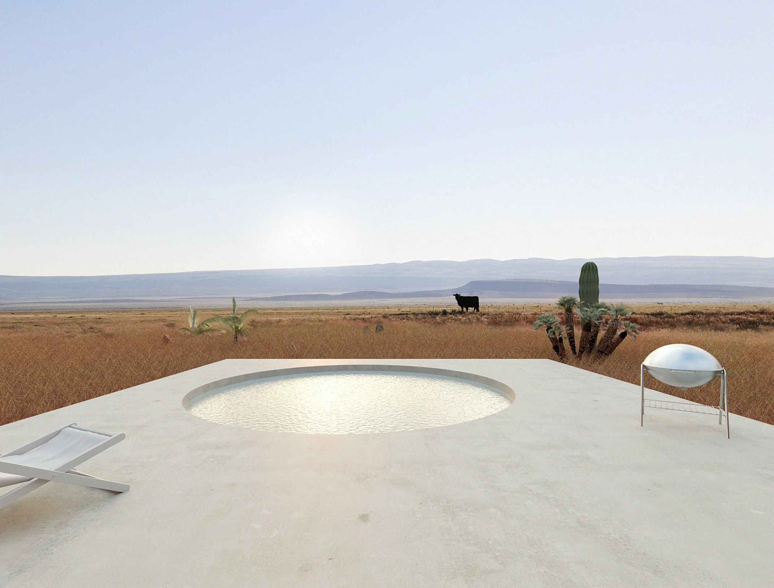 This residence has been designed as a vacation home for a young family and their guests. The home is conceived as one continuous space with no interior walls that is connected by a deep porch that looks out onto the expansive West Texas landscape. This porch both frames the view and provides shelter from the harsh Texas sun. The main house volume is further broken up into four structural units constructed of glulam wooden beams and columns at varying heights. Each space is contained by the expanding and contracting roof above and is programatically defined by different architectural elements. One moves seamlessly between the kitchen, living, and sleeping areas.