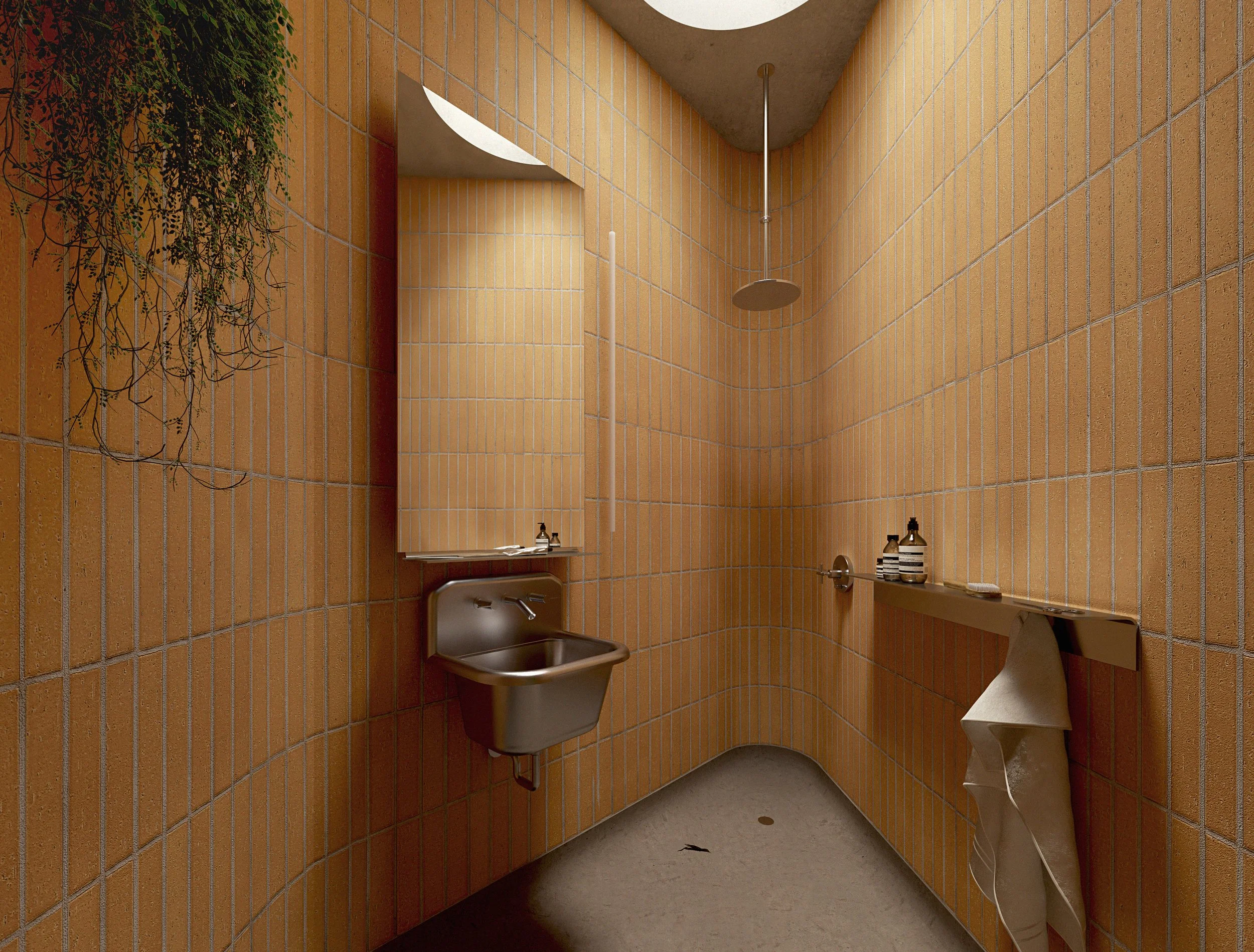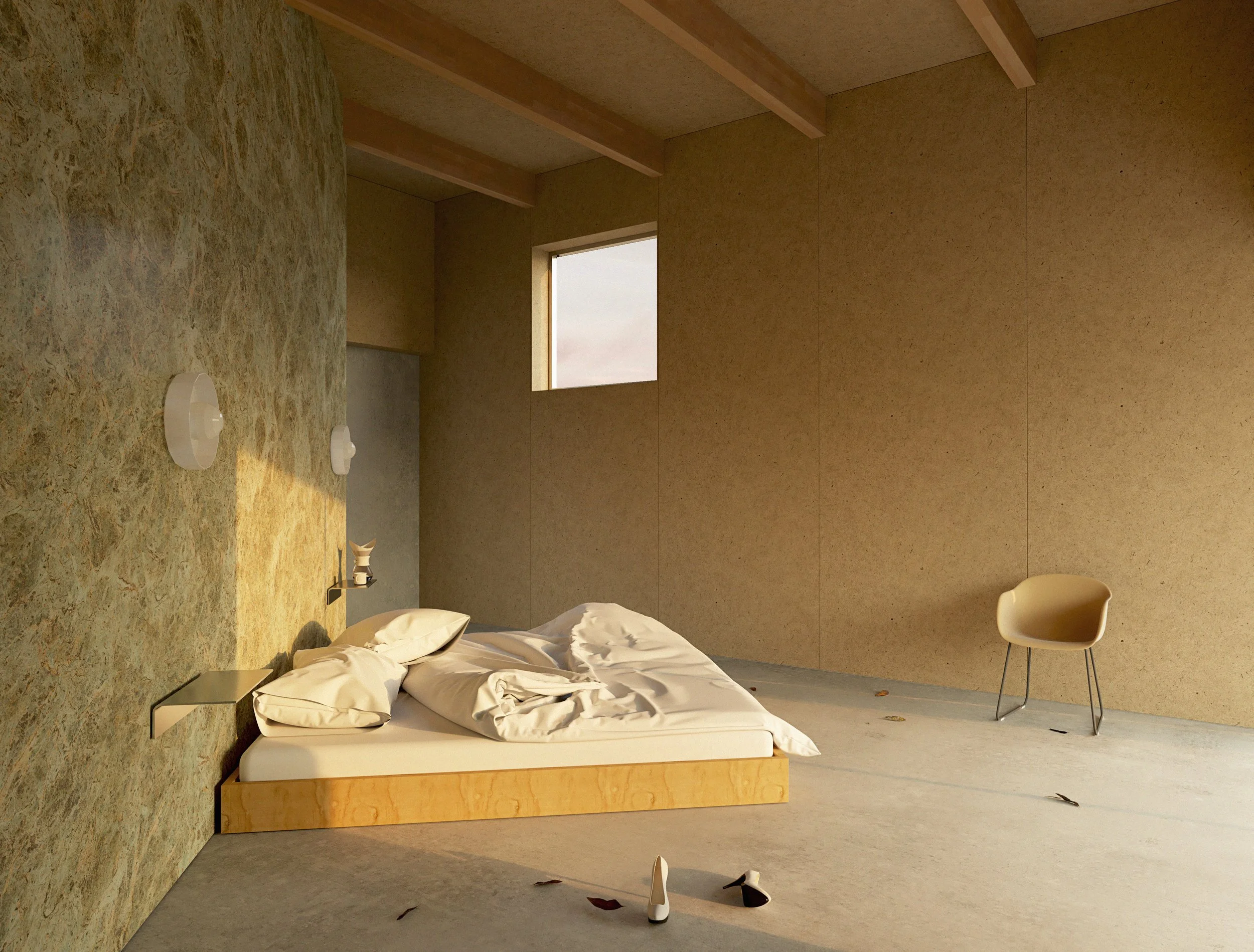 The primary sleeping area (above) is defined by a triangular volume that holds the bathroom and closet. Its angled orientation provides visual privacy that can be supplemented by sound deadening curtains.