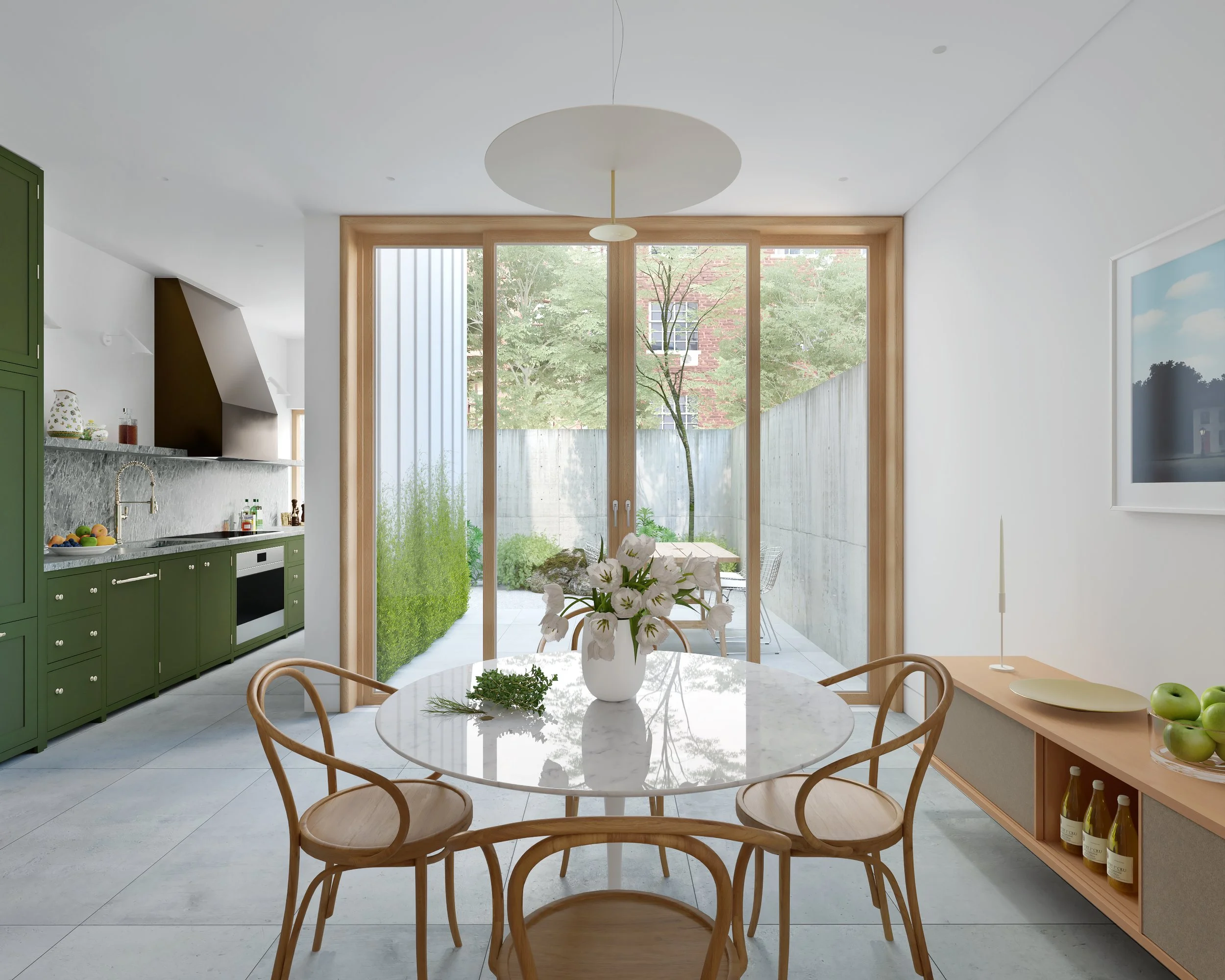 The kitchen occupies an existing rear yard extension that is re-clad in zinc panels which will weather beautifully over time. Slate floor tiles transition seamlessly into the garden.