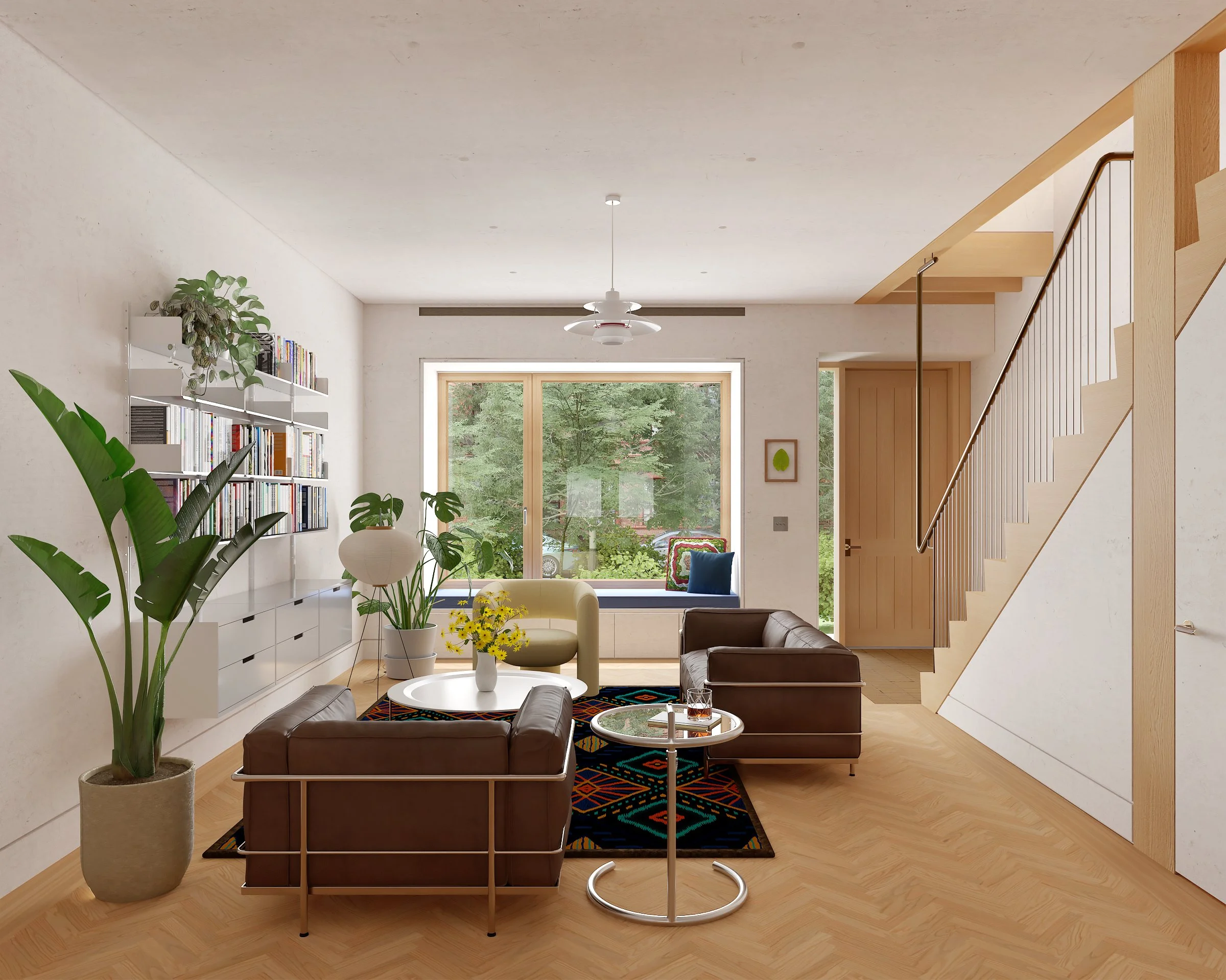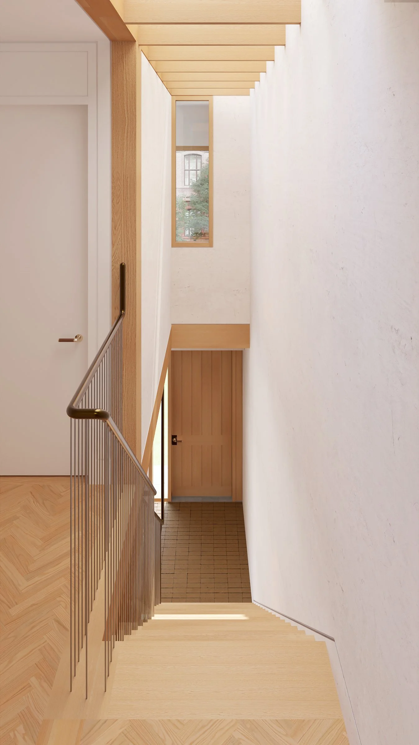 This home is a refurbishment and addition to an existing 2-story brick home. Our design restores the exterior brickwork while making tactical modifications like expanding the size of the windows in the living room. Existing wood joists are reused and framed around a new wooden staircase and cross laminated timber beams form the structure for all new insertions.
