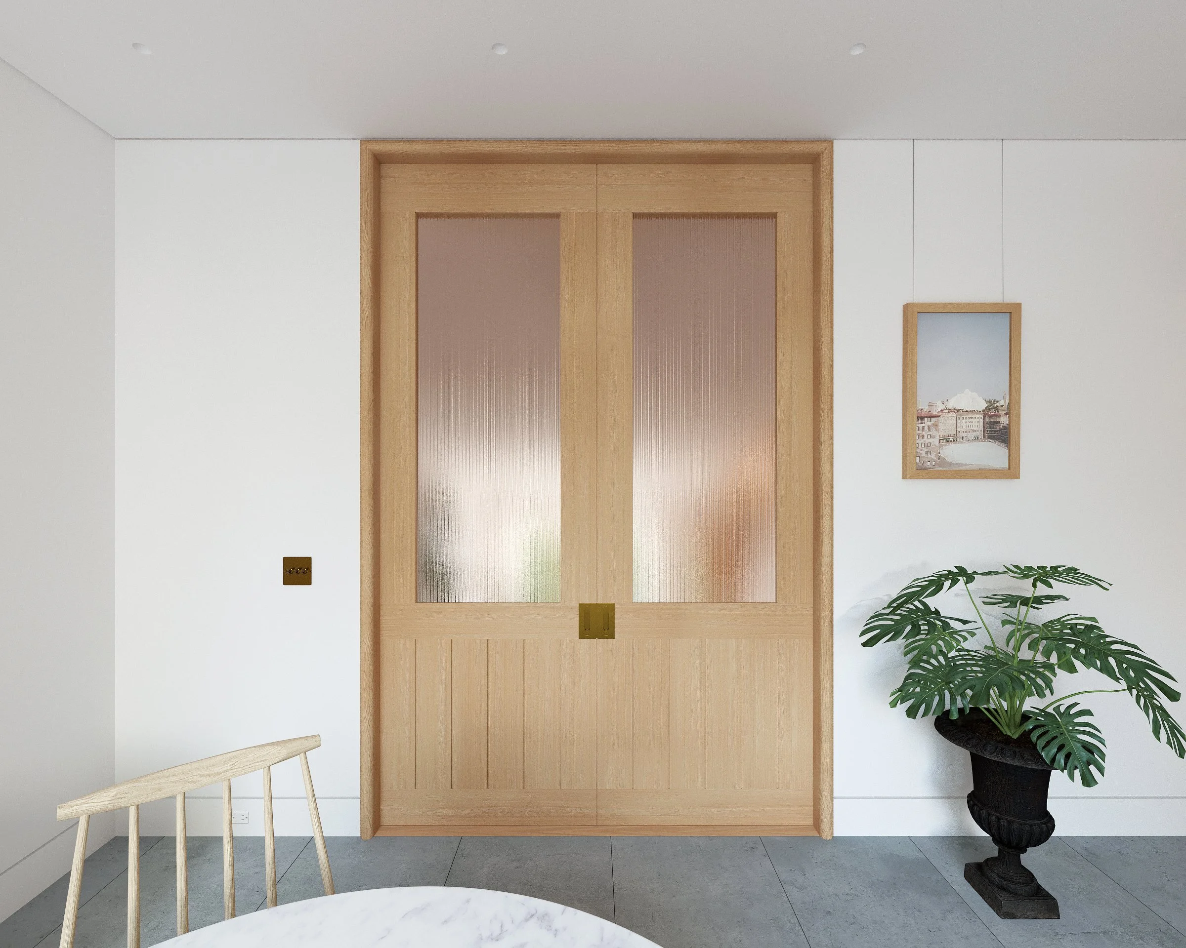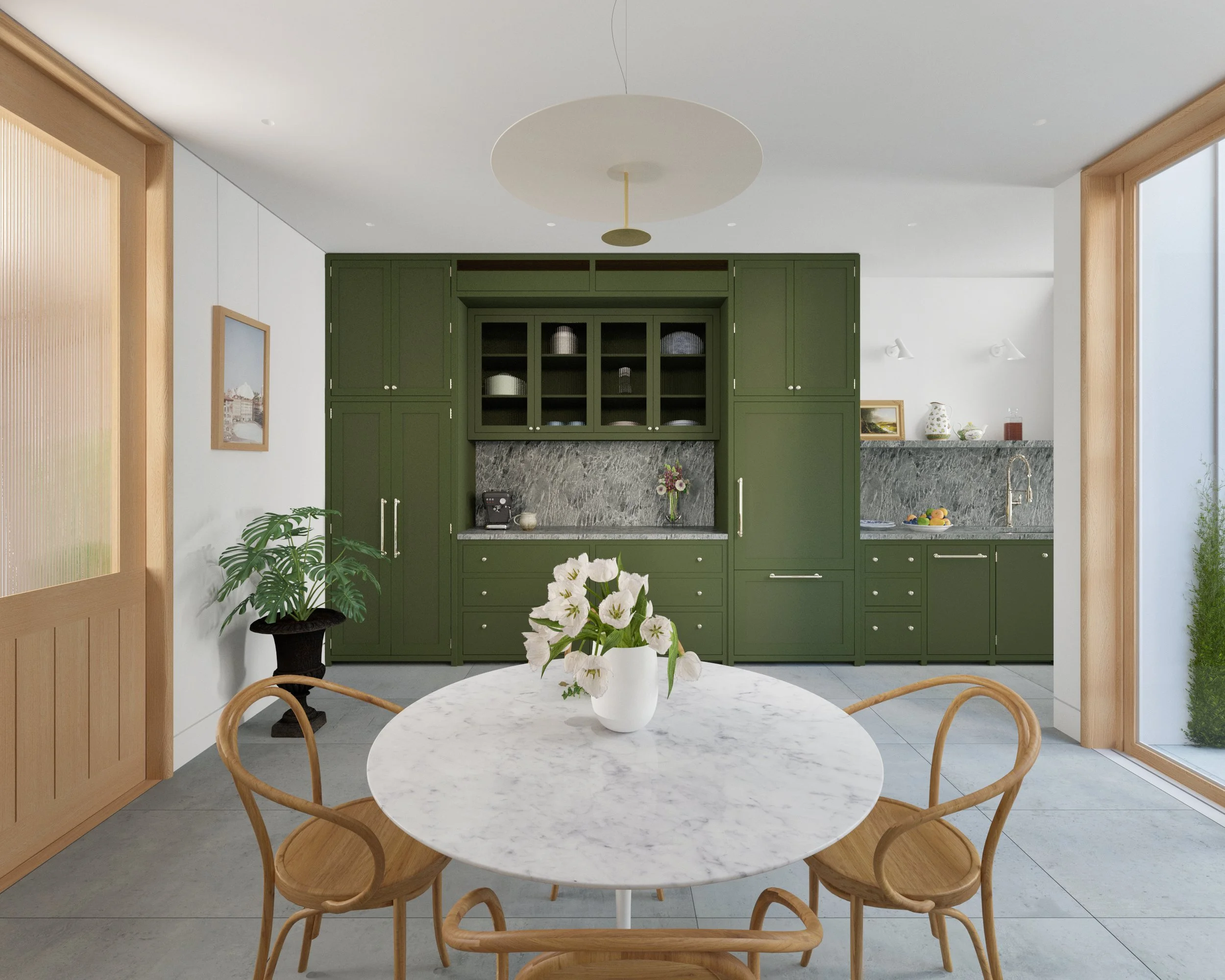 The millwork is Shaker inspired cabinetry by deVOL Kitchens finished in a calming shade of olive green. Custom wood pocket doors with brass hardware and fluted glass provide light and privacy from the living room.